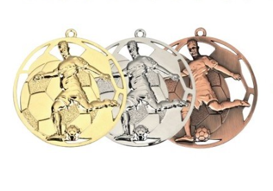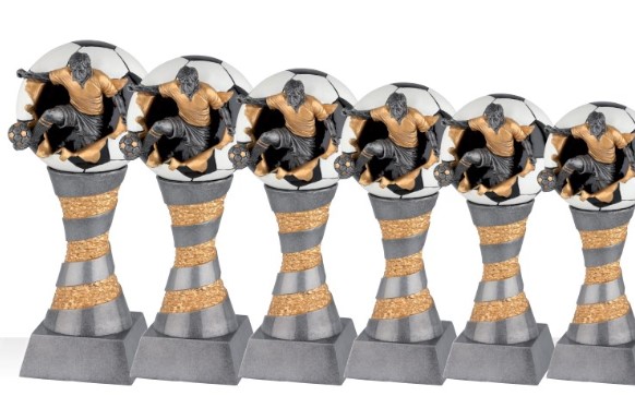 Sportprijzen in veel vormen, kleuren en formaten; bekers, awards, medailles, schalen, beelden, vaantjes en rozetten.
